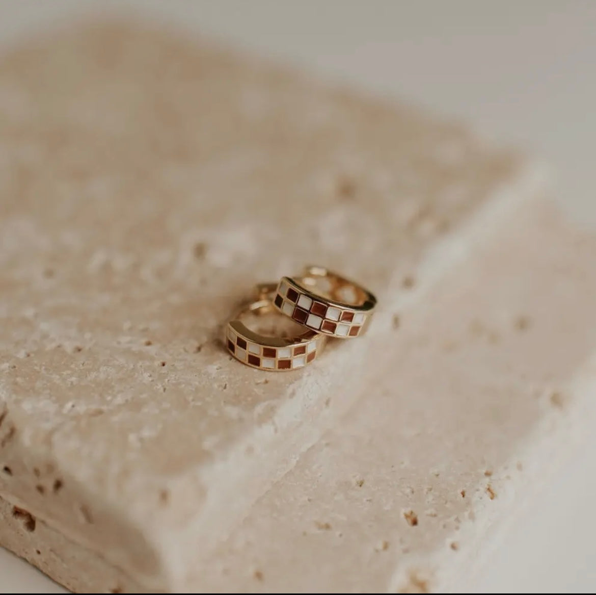 These brown & white checkered hoops are made of high quality gold fill and are hypoallergenic - good for sensitive ears. They have a huggie closure style and are very on trend.
