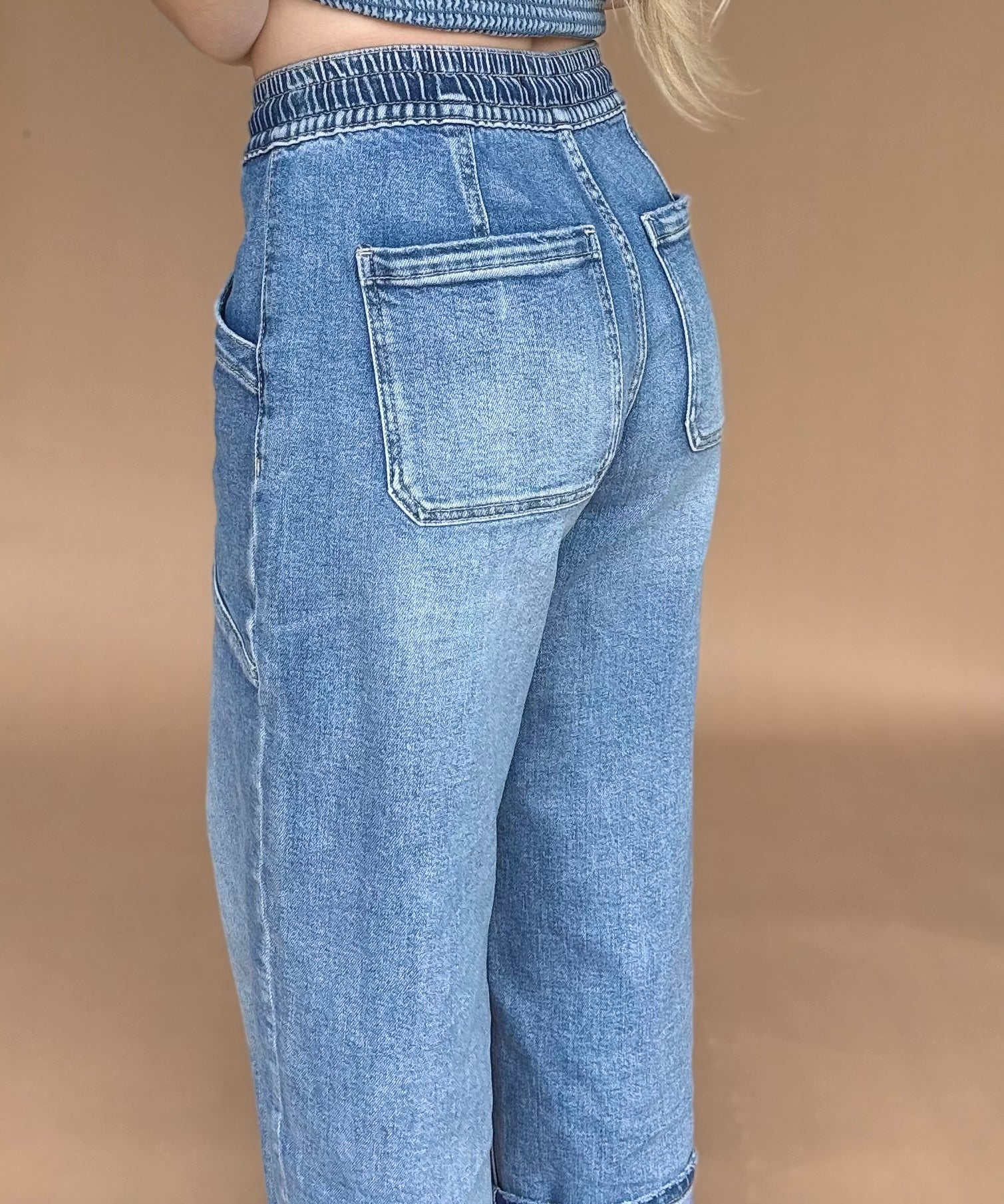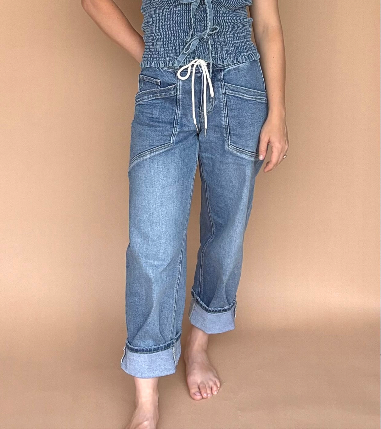 The Bennett Jeans blend comfort and utility with a fresh, laid-back feel. Crafted from 100% cotton denim, they feature a relaxed, slightly slouchy fit with oversized front patch pockets. A natural drawstring at the waist gives them a lived-in charm—perfect for weekend wear, market strolls, or spontaneous road trips.