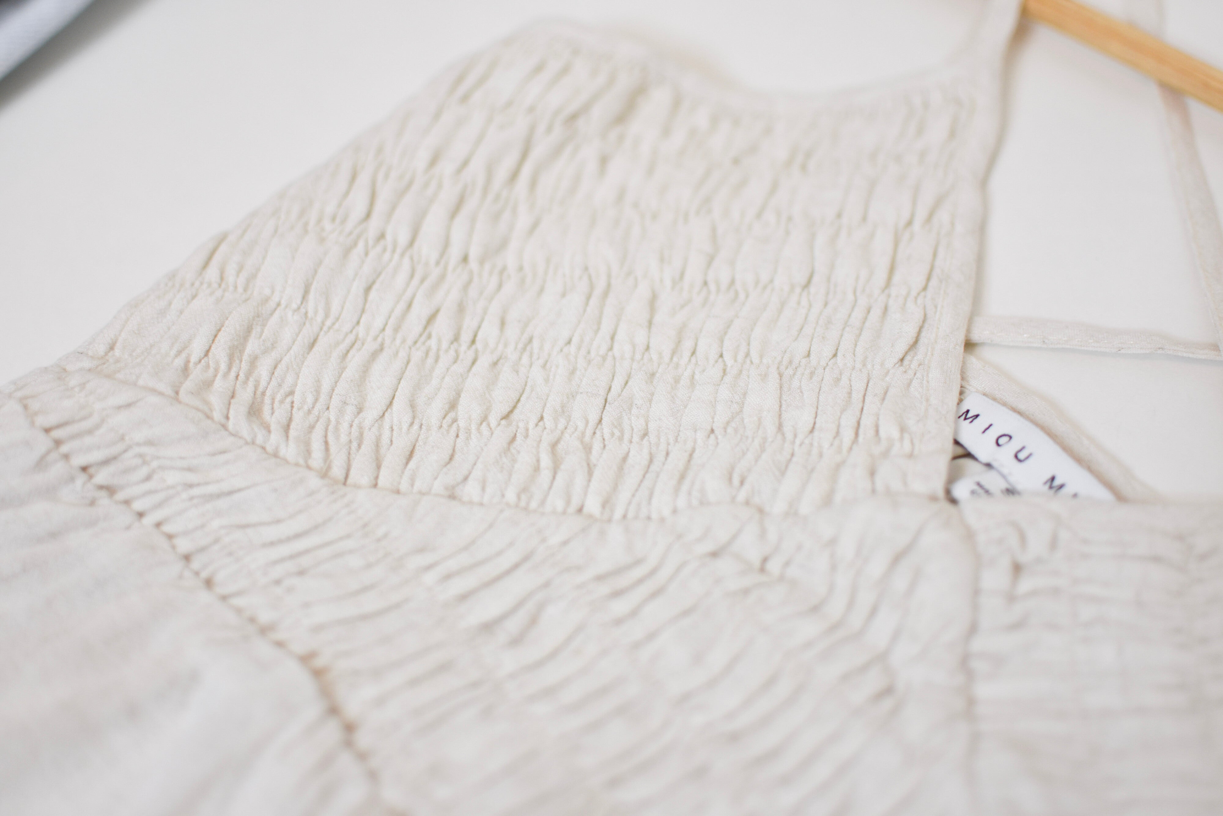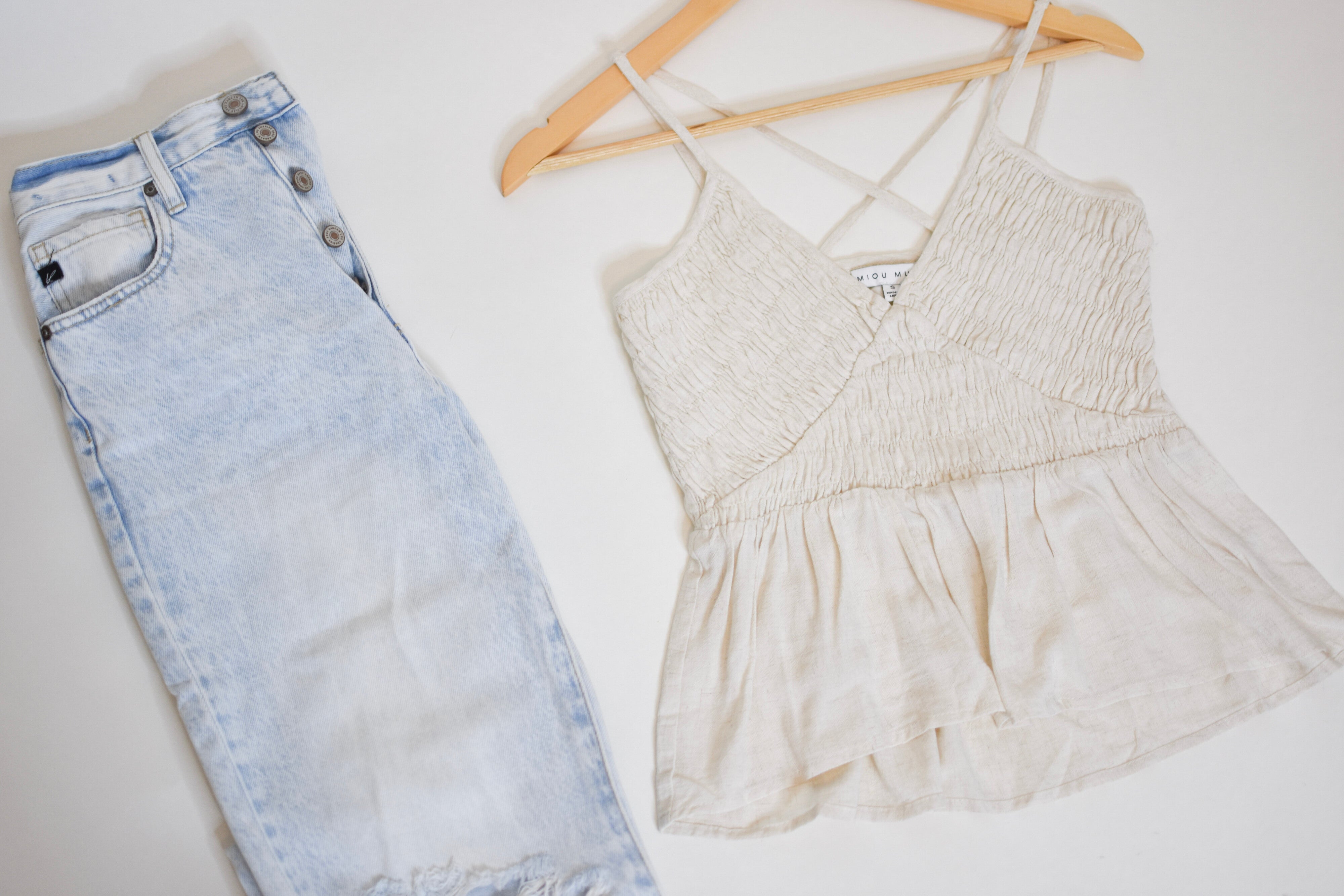 A sweet peplum designed top for the sweetest gals we know. She features a strappy crossed design in the back and a textured tri pieced front. Her natural, linen color is suitable for your Spring and Summer 'fits.