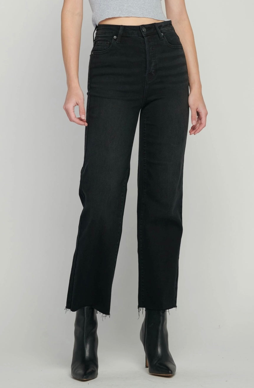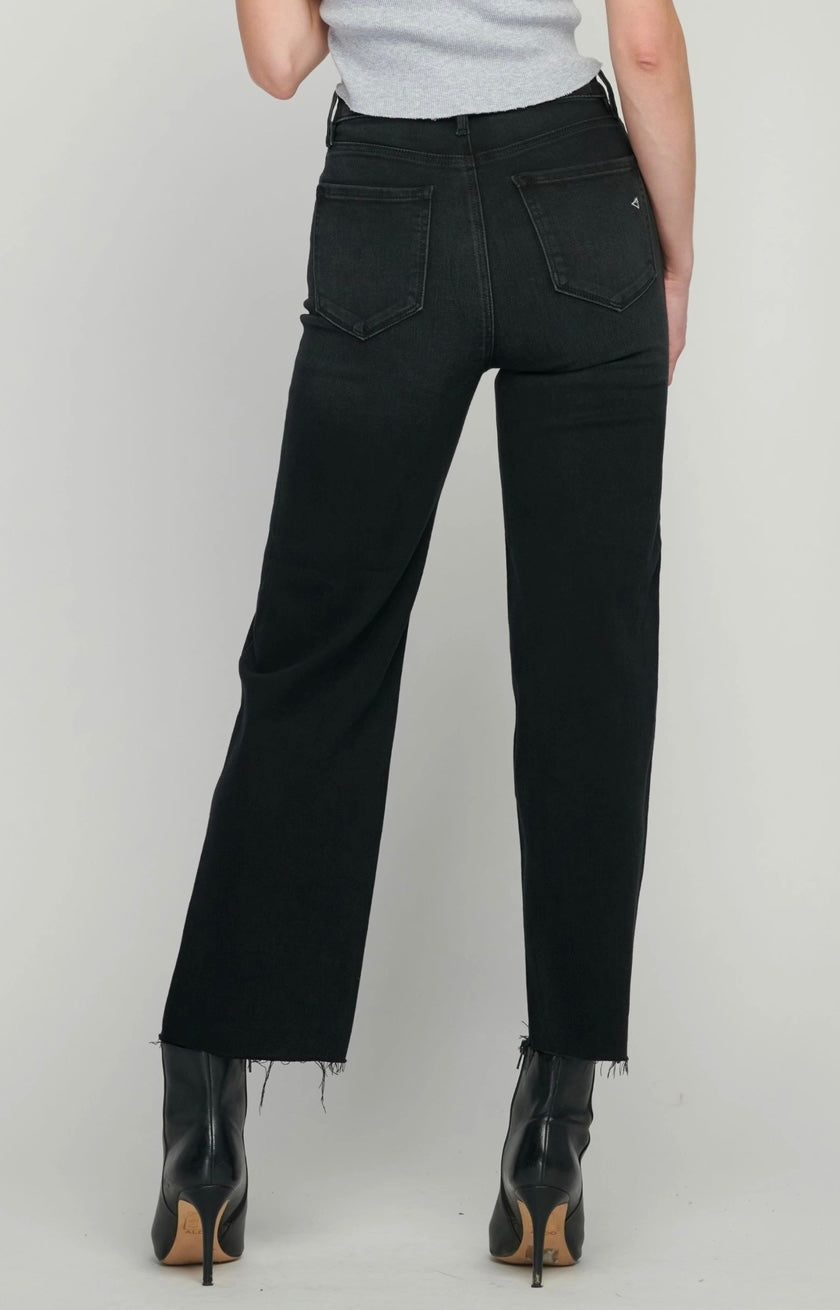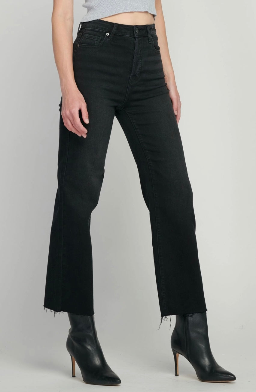 The Fallon high rise jeans are a wardrobe essential that blend sleek minimalism with an edgy vibe. Designed with a flattering high waist and straight-leg silhouette, these jeans offer a structured yet comfortable fit. The washed black finish and raw hem detailing add just the right amount of attitude, making them perfect for both casual and dressed-up looks. Pair with ankle boots or sneakers for versatile style that works from day to night.
