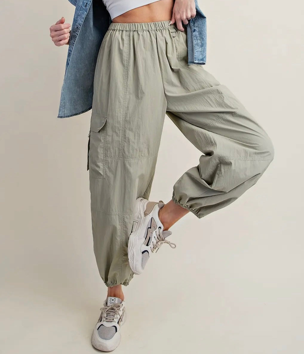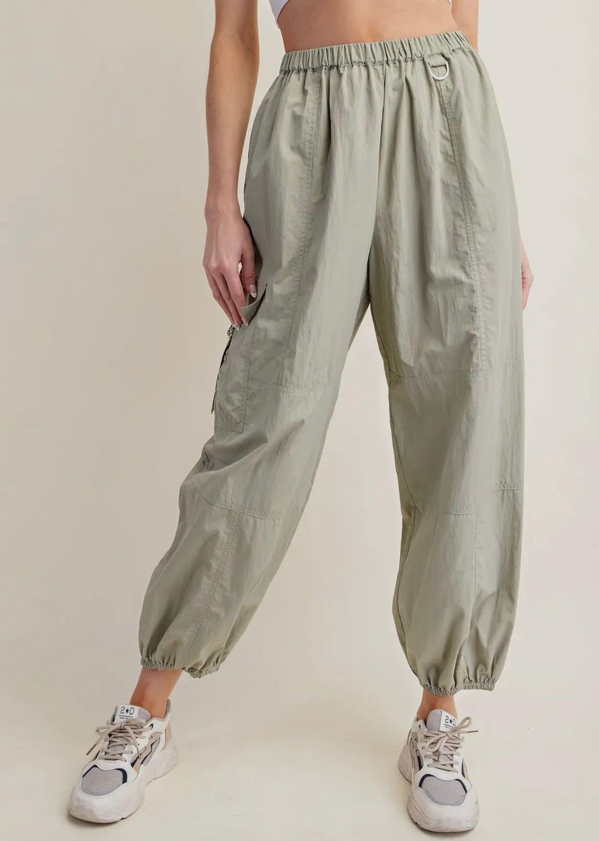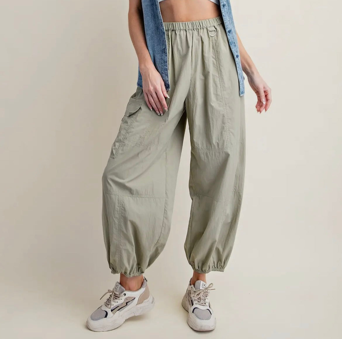 Balloon cargo pants in a refreshing light olive shade.  Lightweight and functional.
