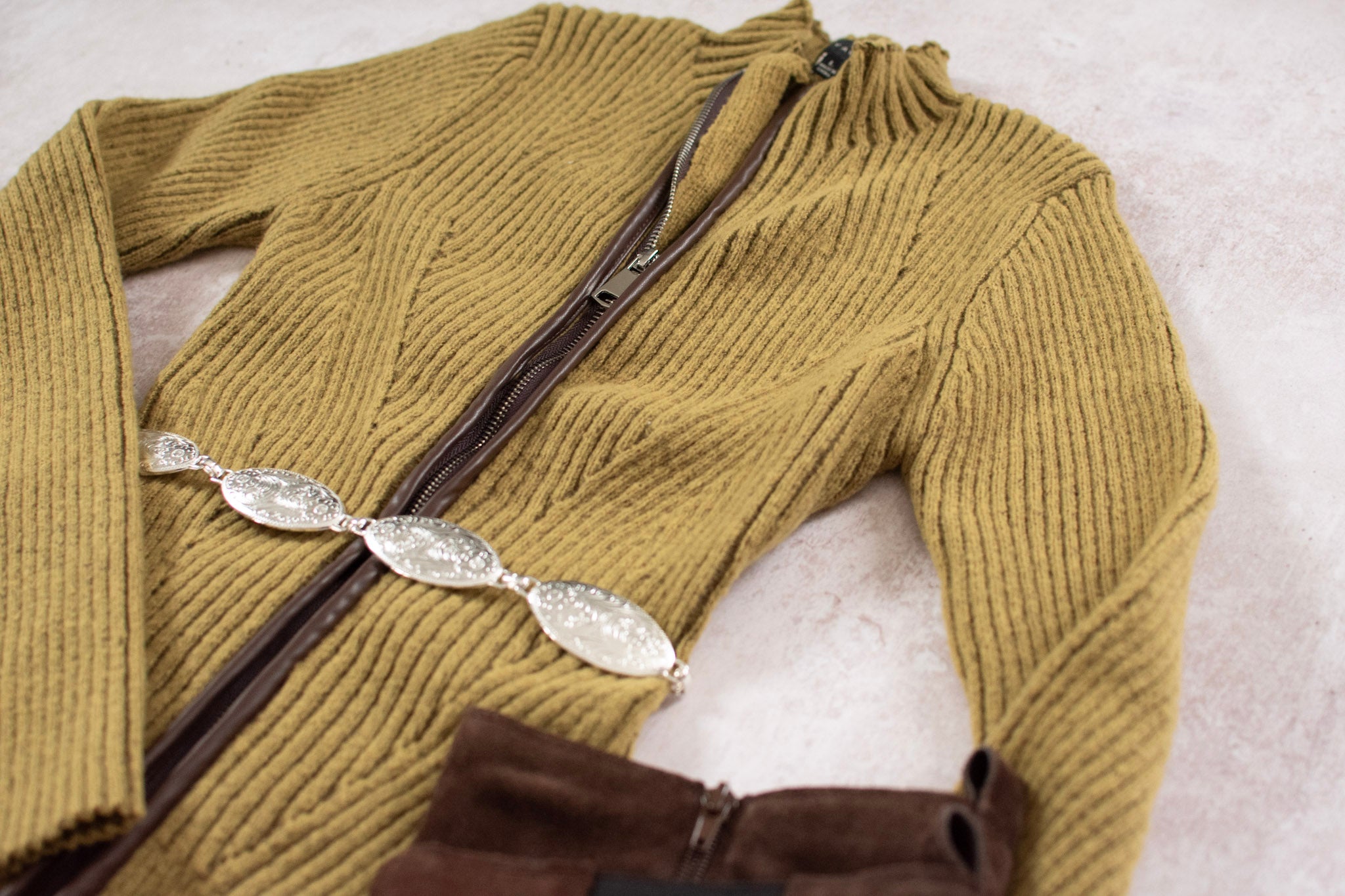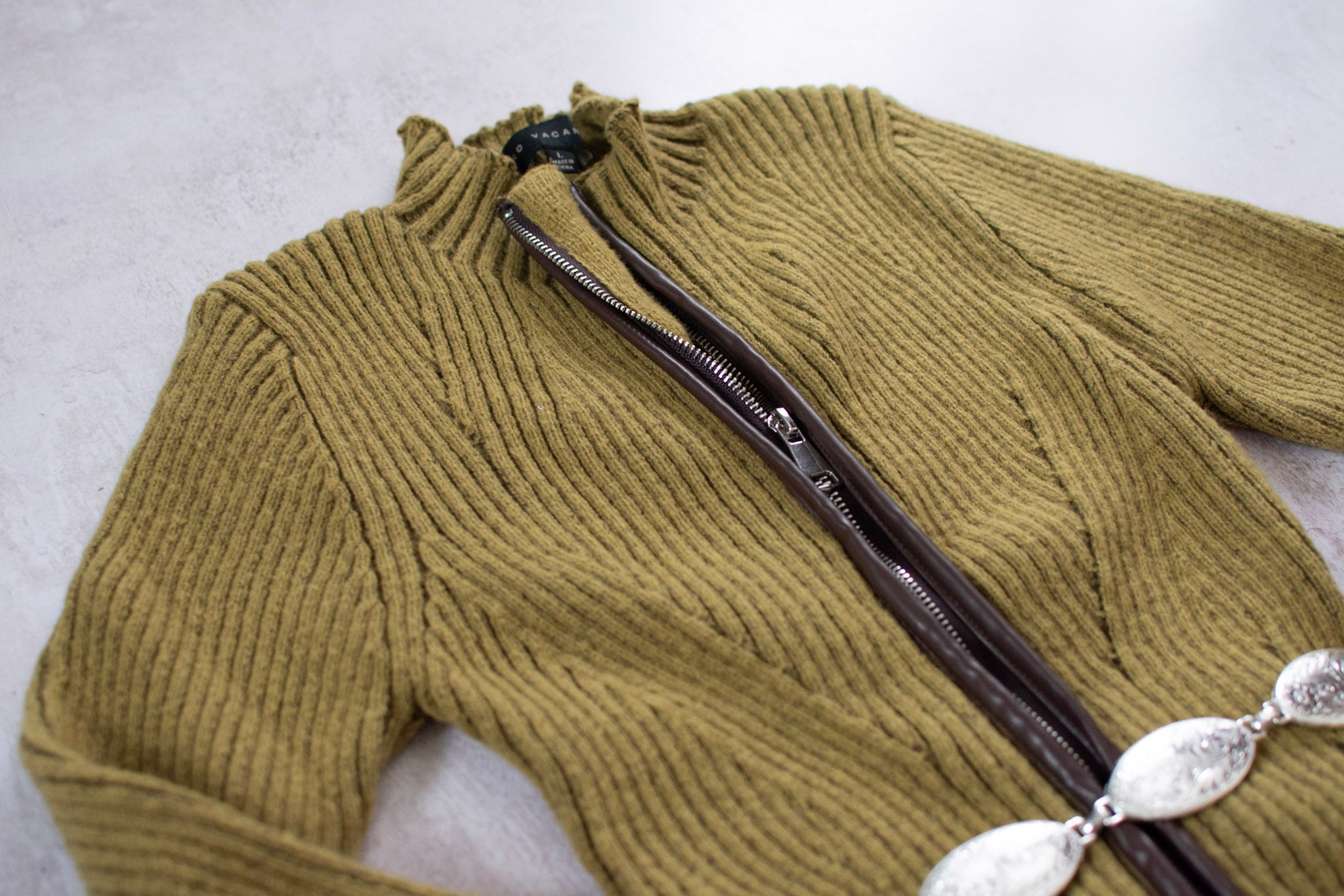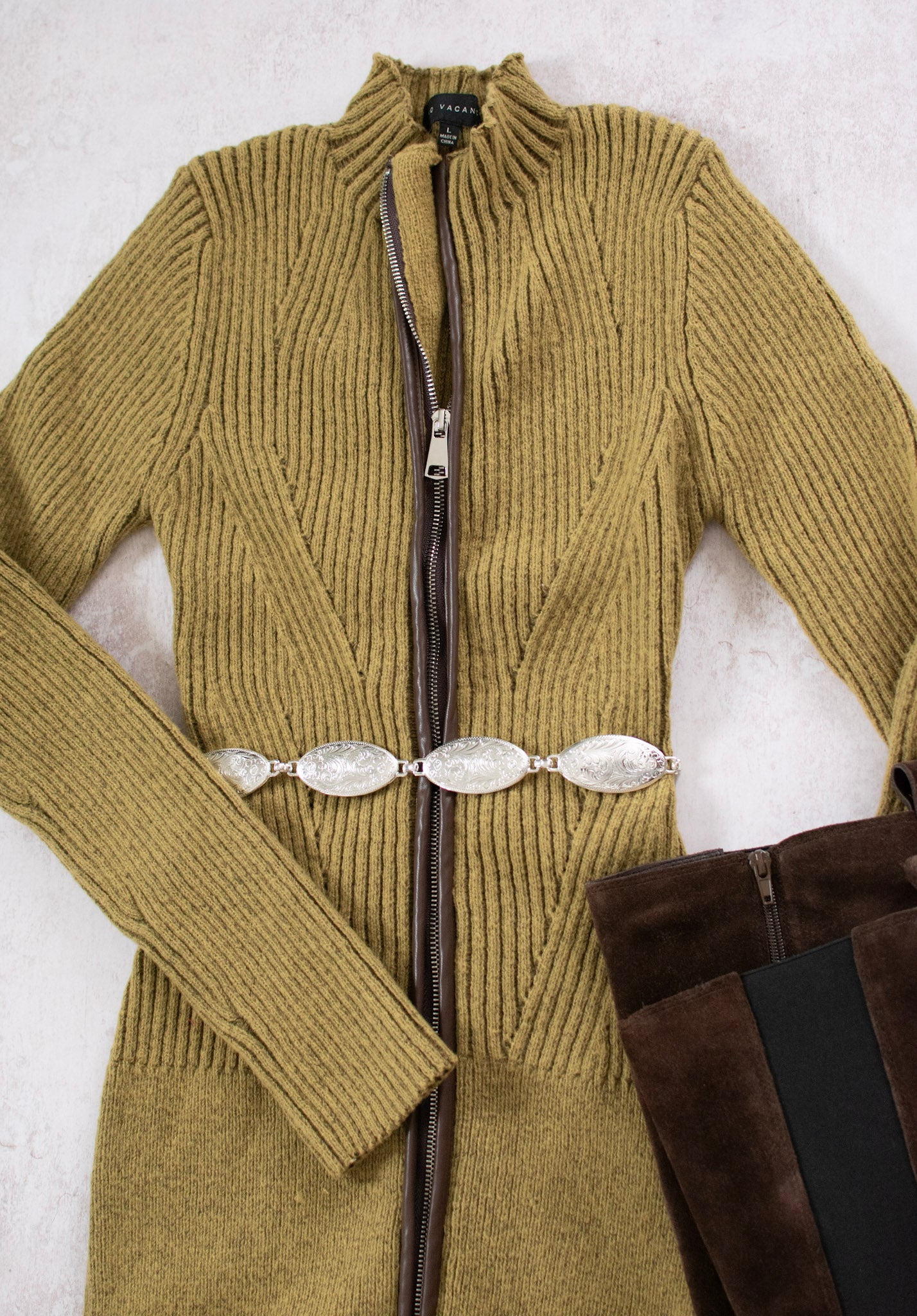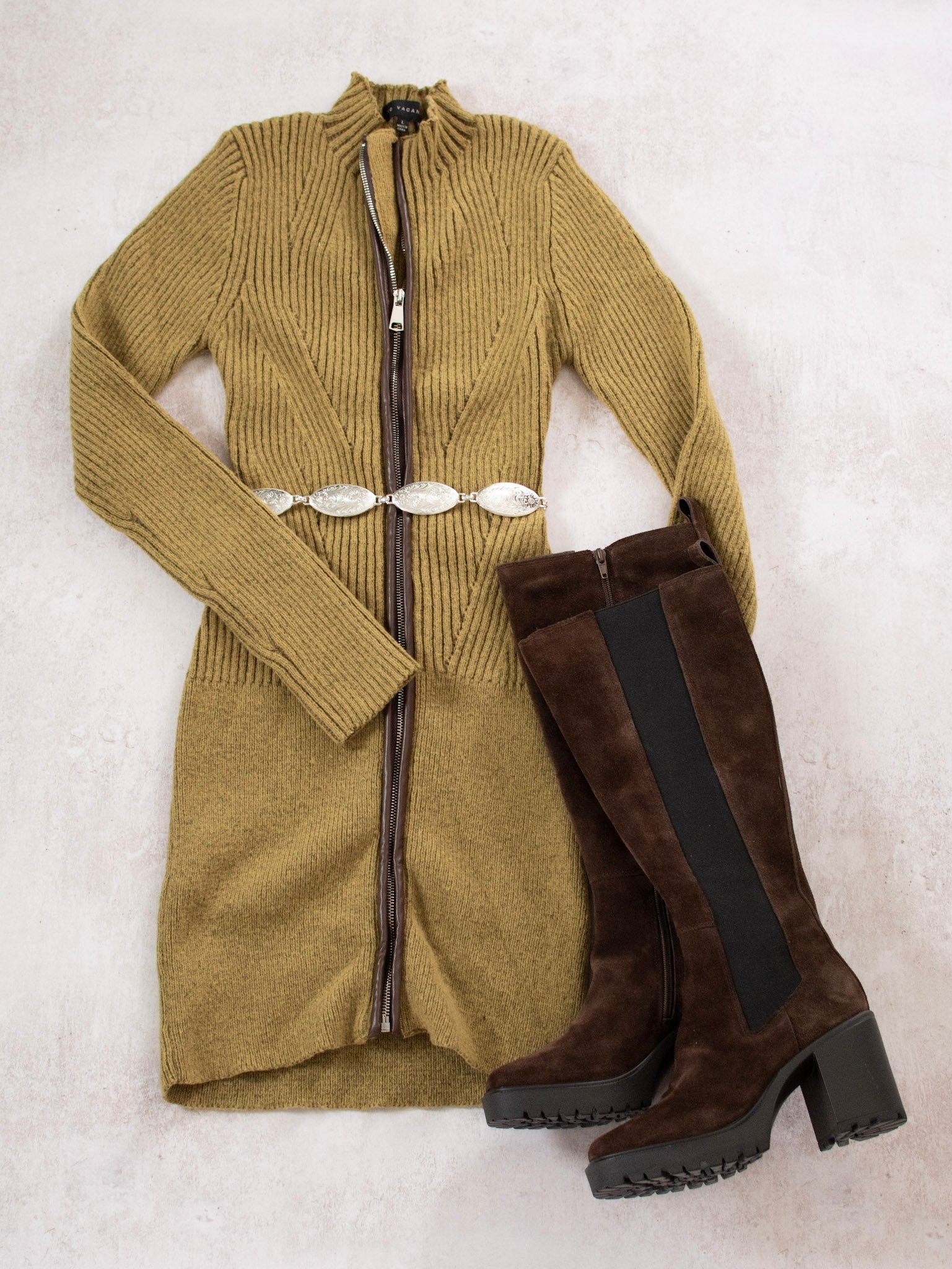 Designed with warmth in mind, but Spring on the horizon.  The Zara gives a more contoured shape through her thoughtfully constructed knitted profile.  A playful mini with a modest half mock turtle neckline.  But it's all in the details with her chocolate brown, faux-leather zipper closure starring front and center, and if you love hues of green this Mossy color will brighten your day.  Don't worry - she's not just seasonal.  Dress her with some knee high boots and tights for a Winter night out with the girls, or short booties heading into the Spring.