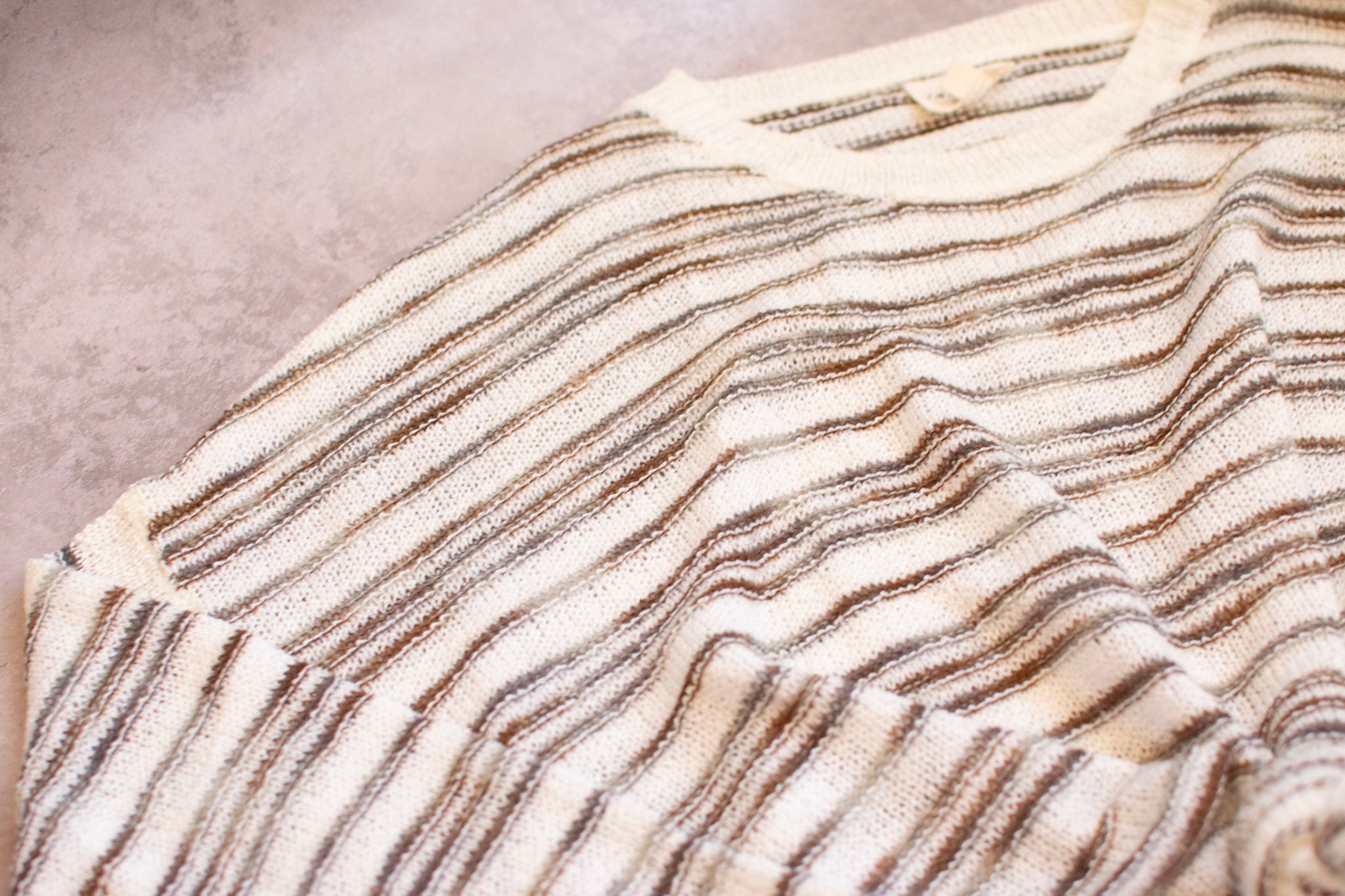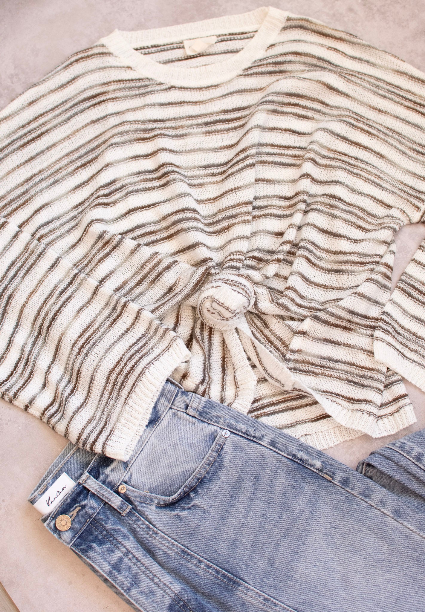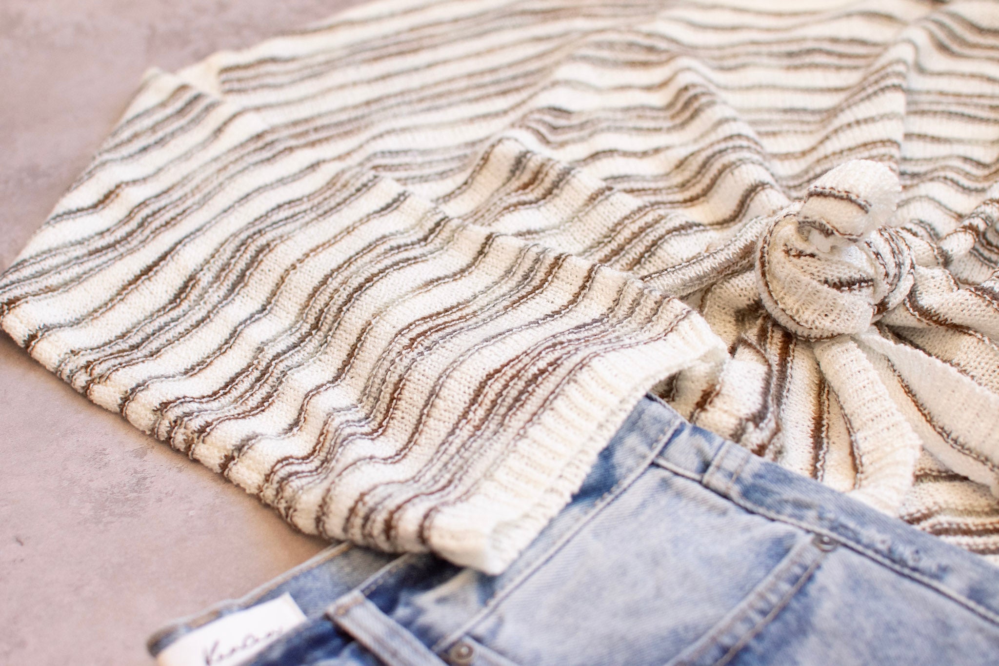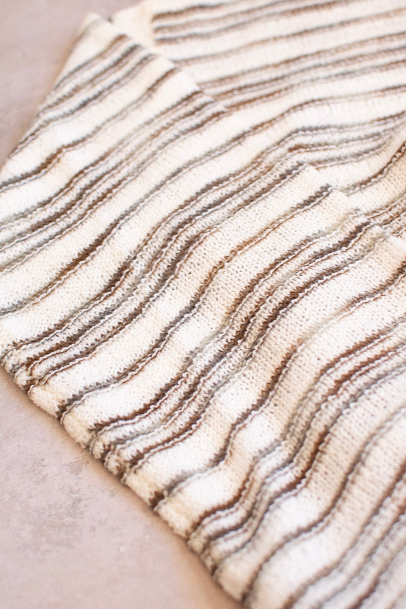 The almost-retro look.  We love her oversized fit - let her loose or tie her up to create multiple looks.  She's composed of a very lightweight knit and designed in a sporadic line pattern of brown hues.