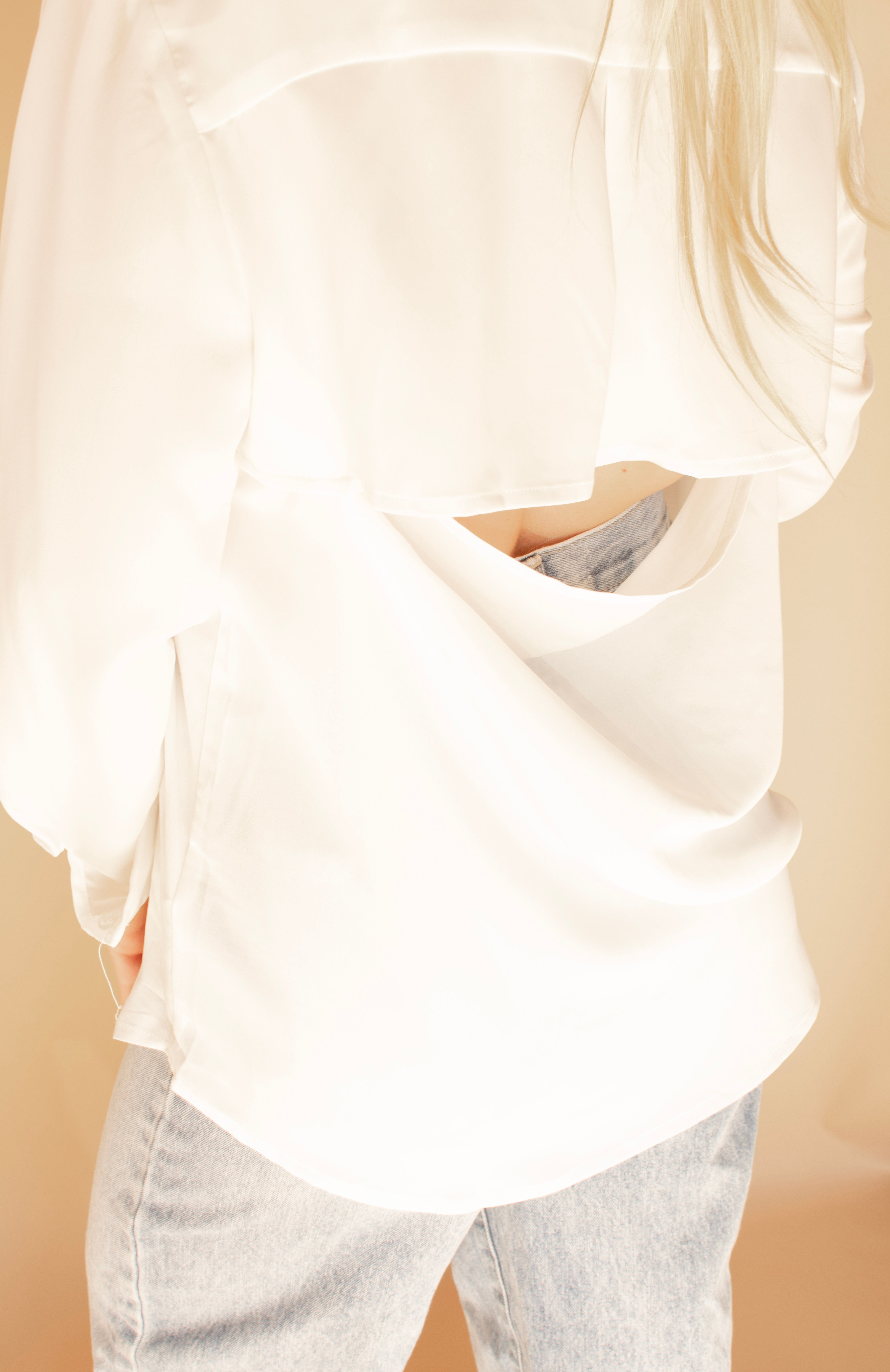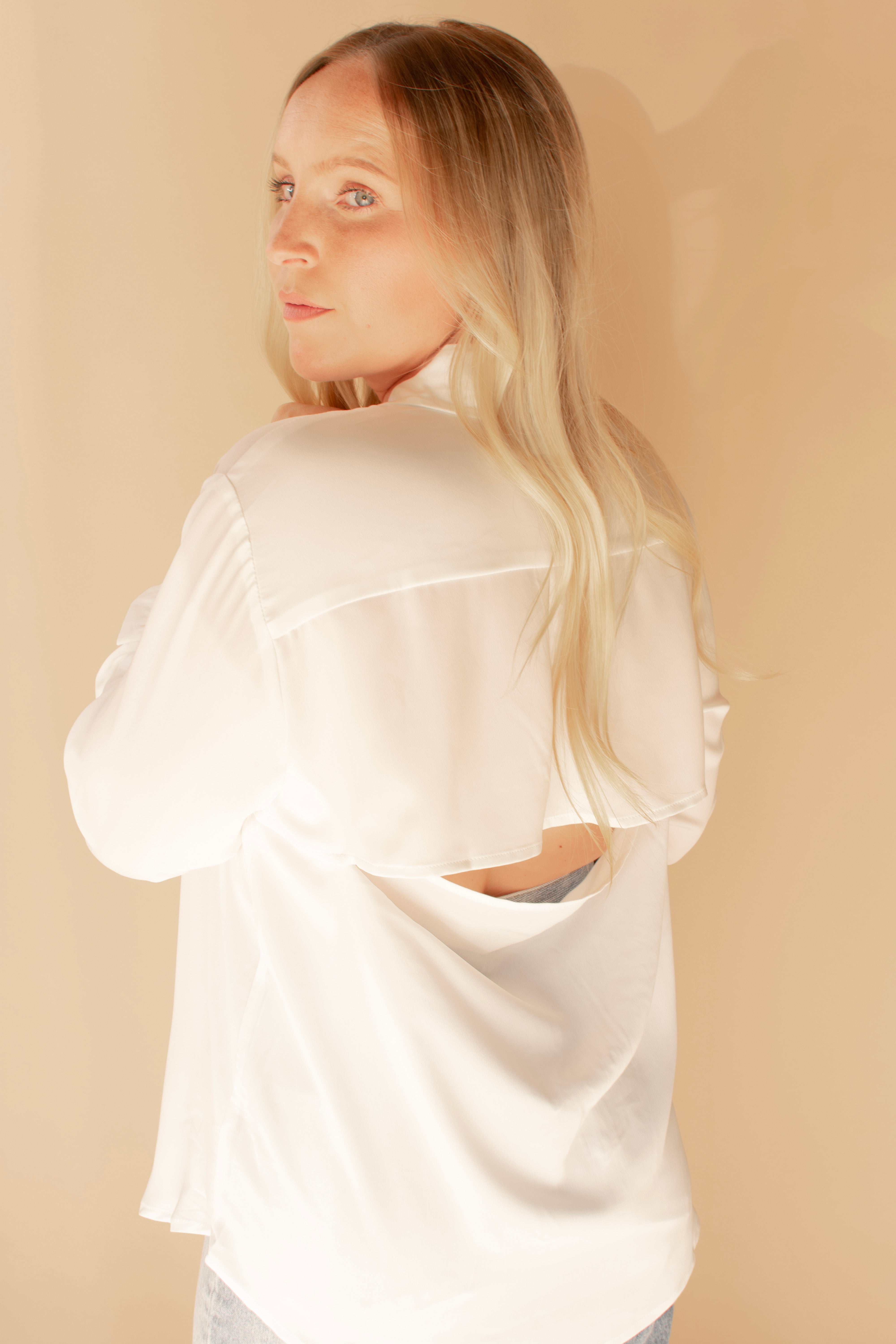 The most feminine collared, button-down top.  She’s not your average business top, but rather uniquely detailed with her slightly open-back design and pearl buttons.