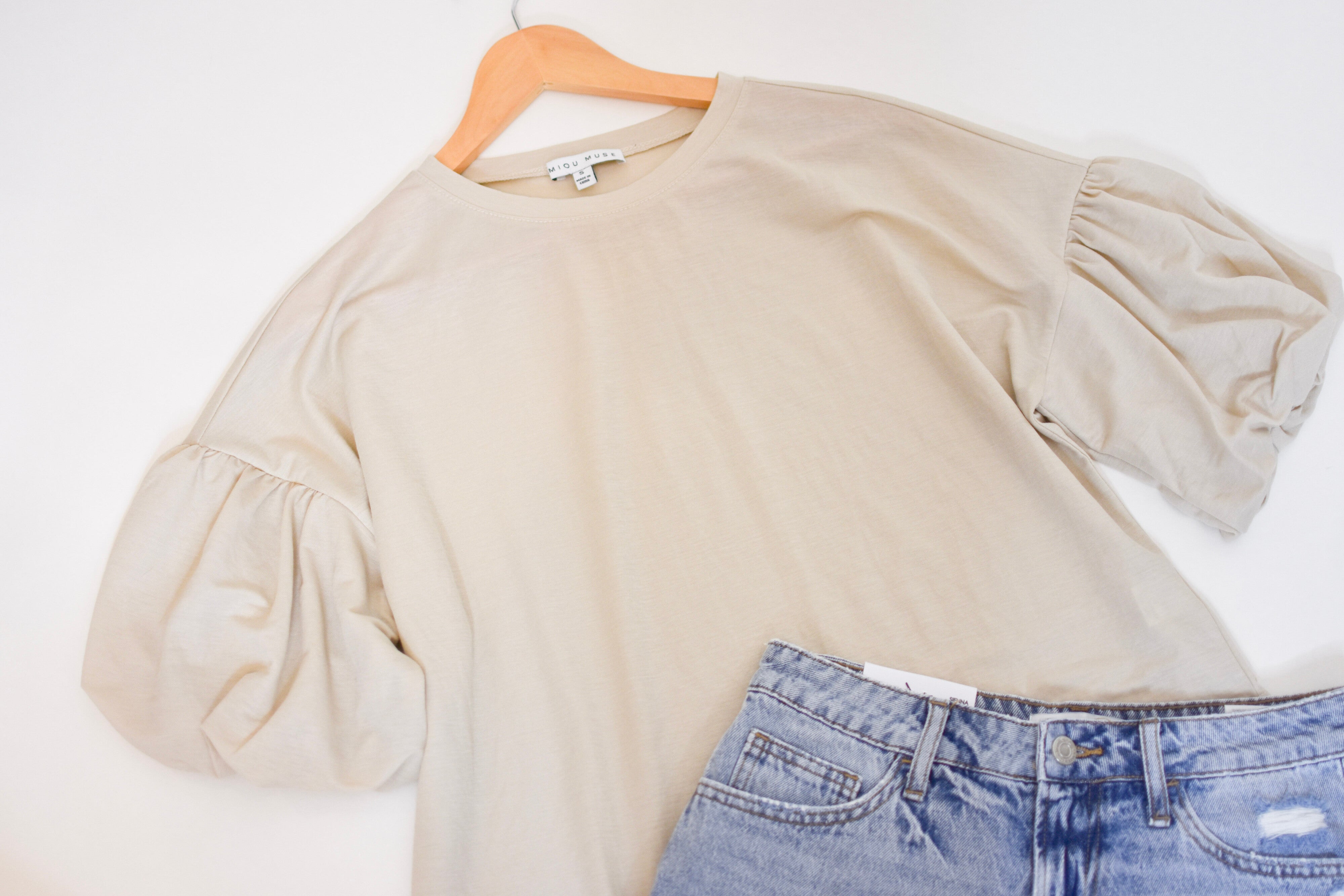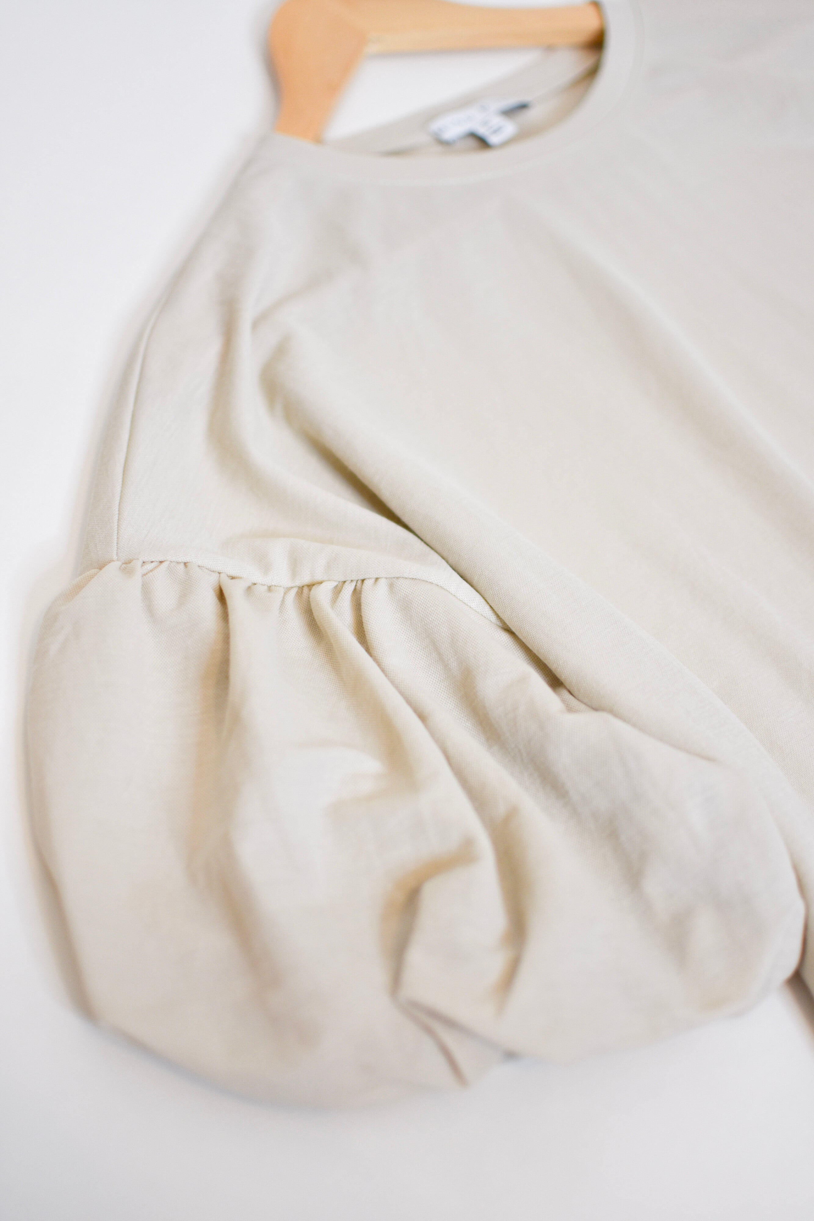 A more intricate take on your casual tee. High quality and designed with balloon sleeves dropping to a 3/4 length.